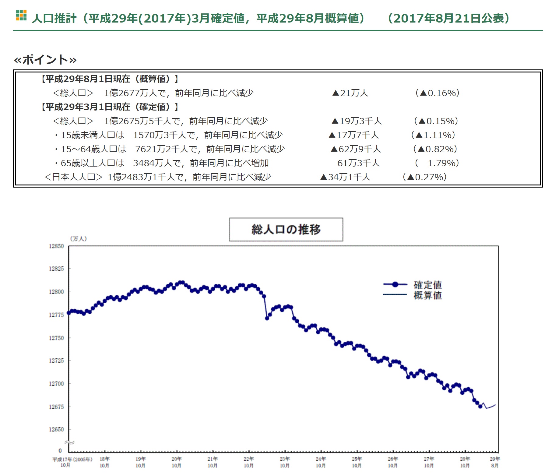 平成27年度の人口は127,095万人です。生産年齢人口(18歳から65歳)は60.7%、年少人口は12.6%、老年人口は26.6%です。生産年齢人口6名で、社会福祉の対象となる子ども1人とお年寄り3人を支えている構造です。
