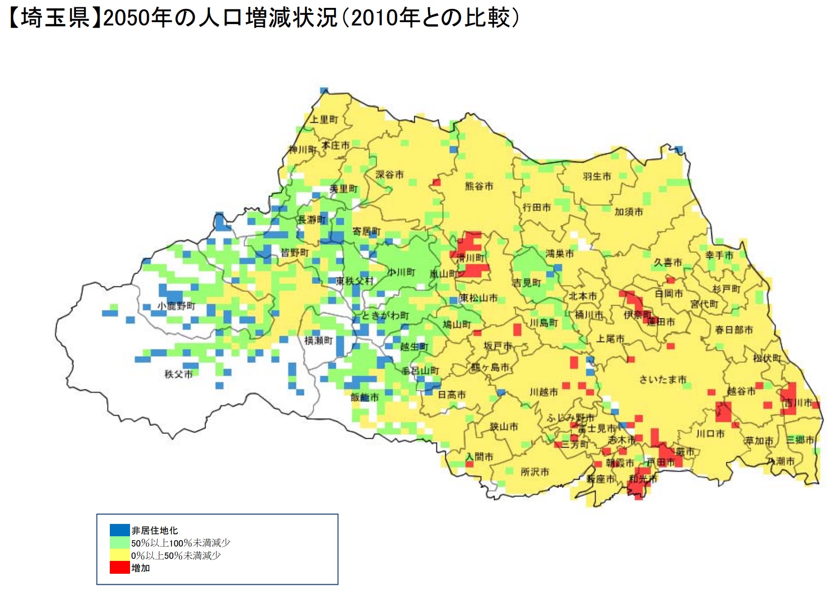 埼玉県では県の中央部より、和光市、新座市、朝霞市、志木市、戸田市など東京に隣接する地域での増加予測が目立ちます。